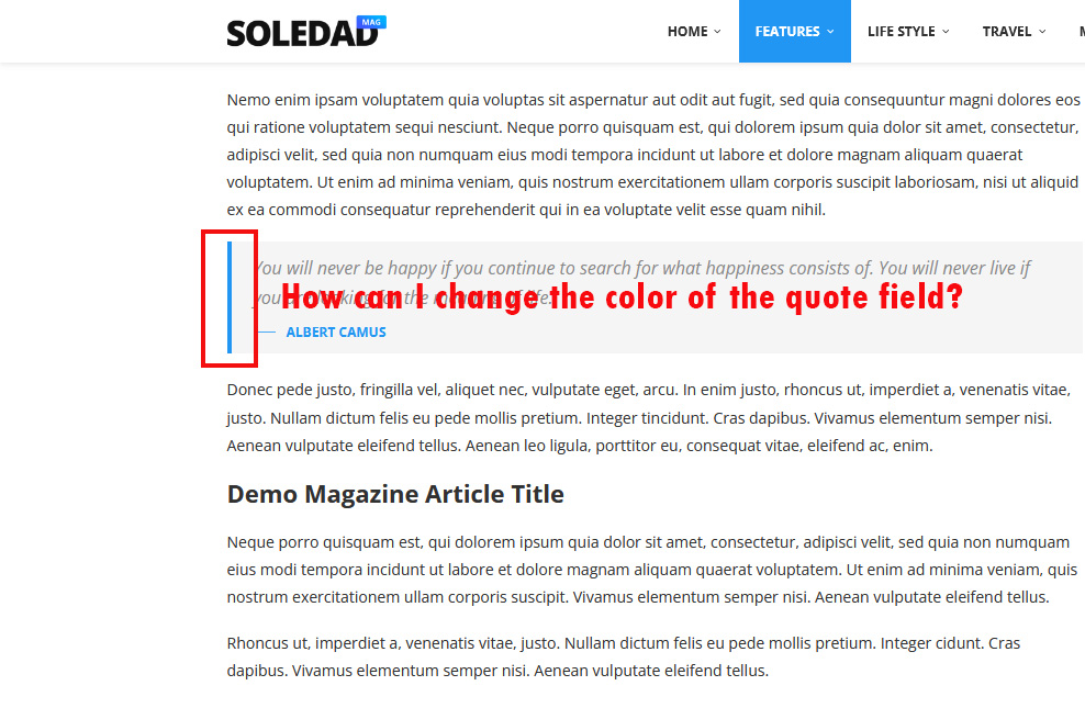 .post-entry .wp-block-quote, .woocommerce .page-description .wp-block-quote, .wpb_text_column .wp-block-quote { border-left-color: #333; }Please replace #333 with your preferred custom color code. You can find the color code on this page: https://htmlcolorcodes.com/