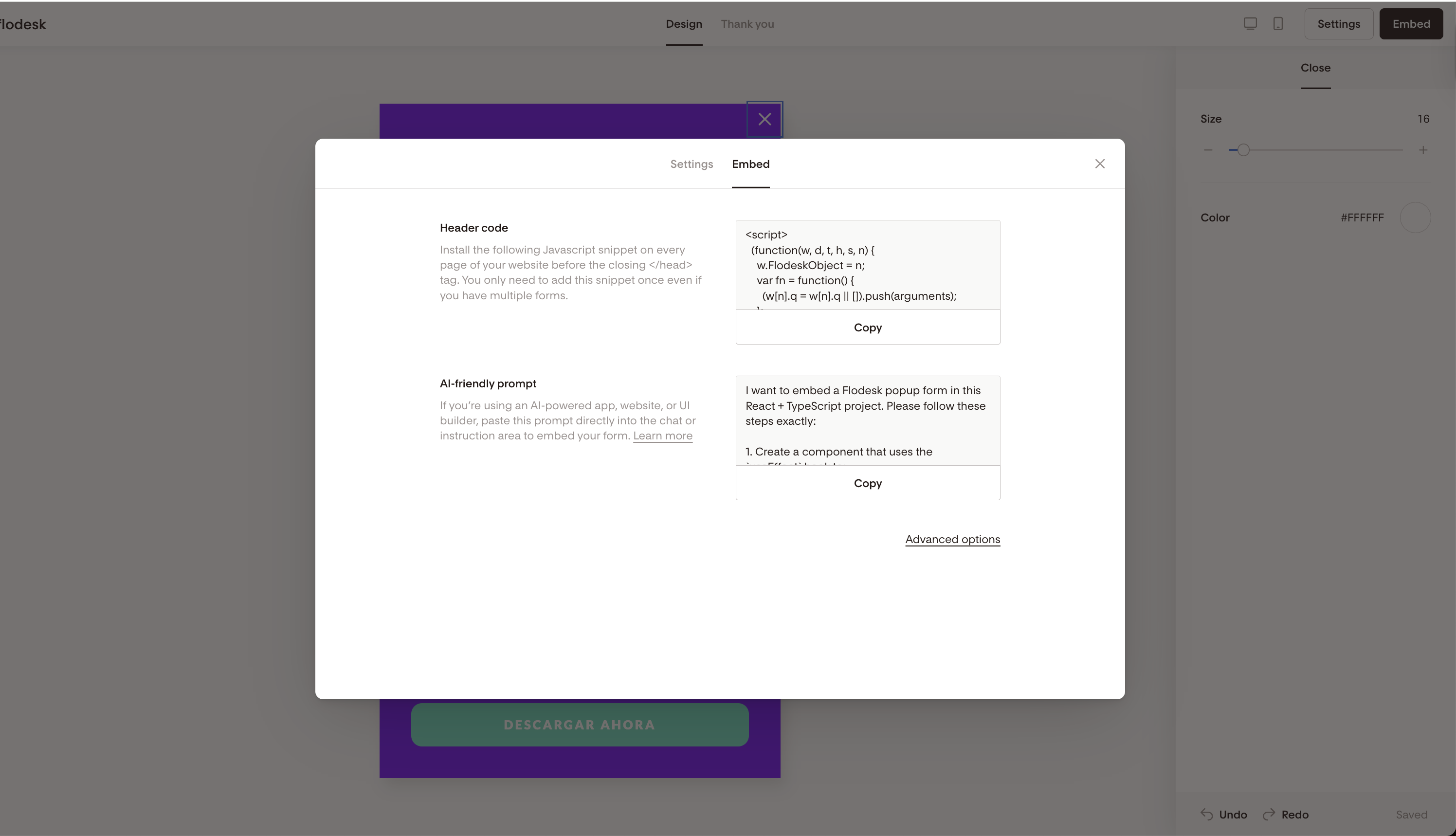 For context, it's a pop-up I created on Flodesk (email marketing software), and in the install instructions, they ask to add a code (snippet) in the header.php