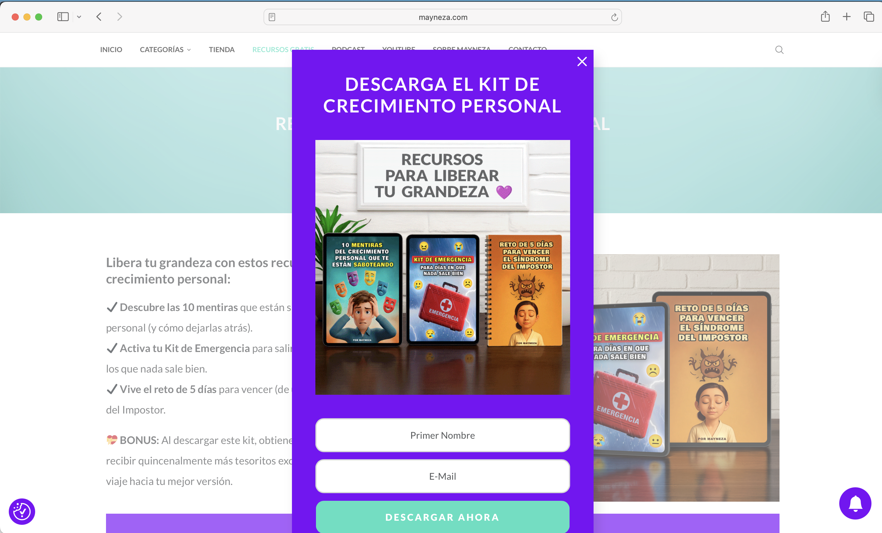 1) How can I hide this pop-up (appears after 30 seconds and when scrolling) ONLY on this page that has this ID 10396: https://mayneza.com/recursos-crecimiento-personal/? It's because the pop-up is asking to download the same resources as that very same landing page, and that is not user-friendly.
