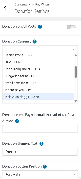 2/ You need to enter the PayPal email address to receive payments either in the User Profile or via Appearance → Customize → Pay Writer → Donation Settings → Donate to one PayPal email instead of Post Author.